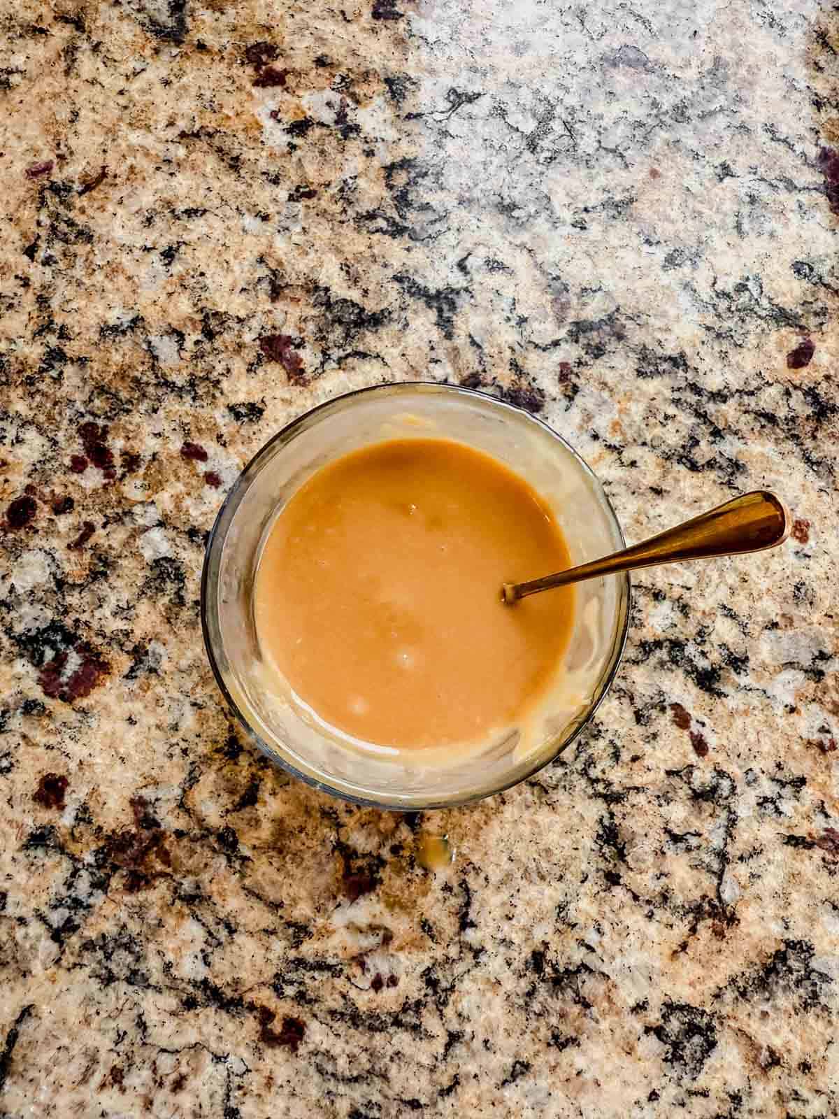 - Melt the caramel in a microwave safe bowl in 30 second increments until melted and smooth. Cool for 5 min to firm up so it’s pourable but holds its shape.