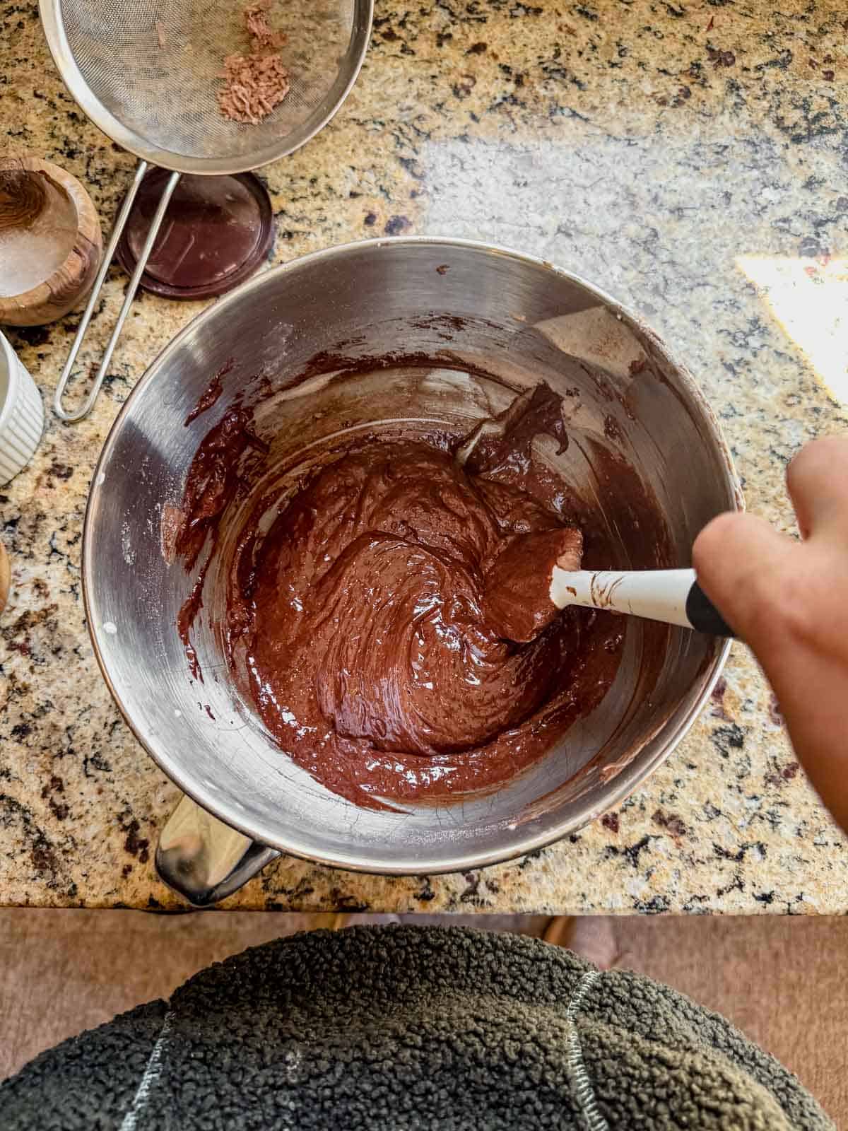 - Stir in dry ingredients and gently fold until you get a smooth glossy batter, similar to brownie batter.