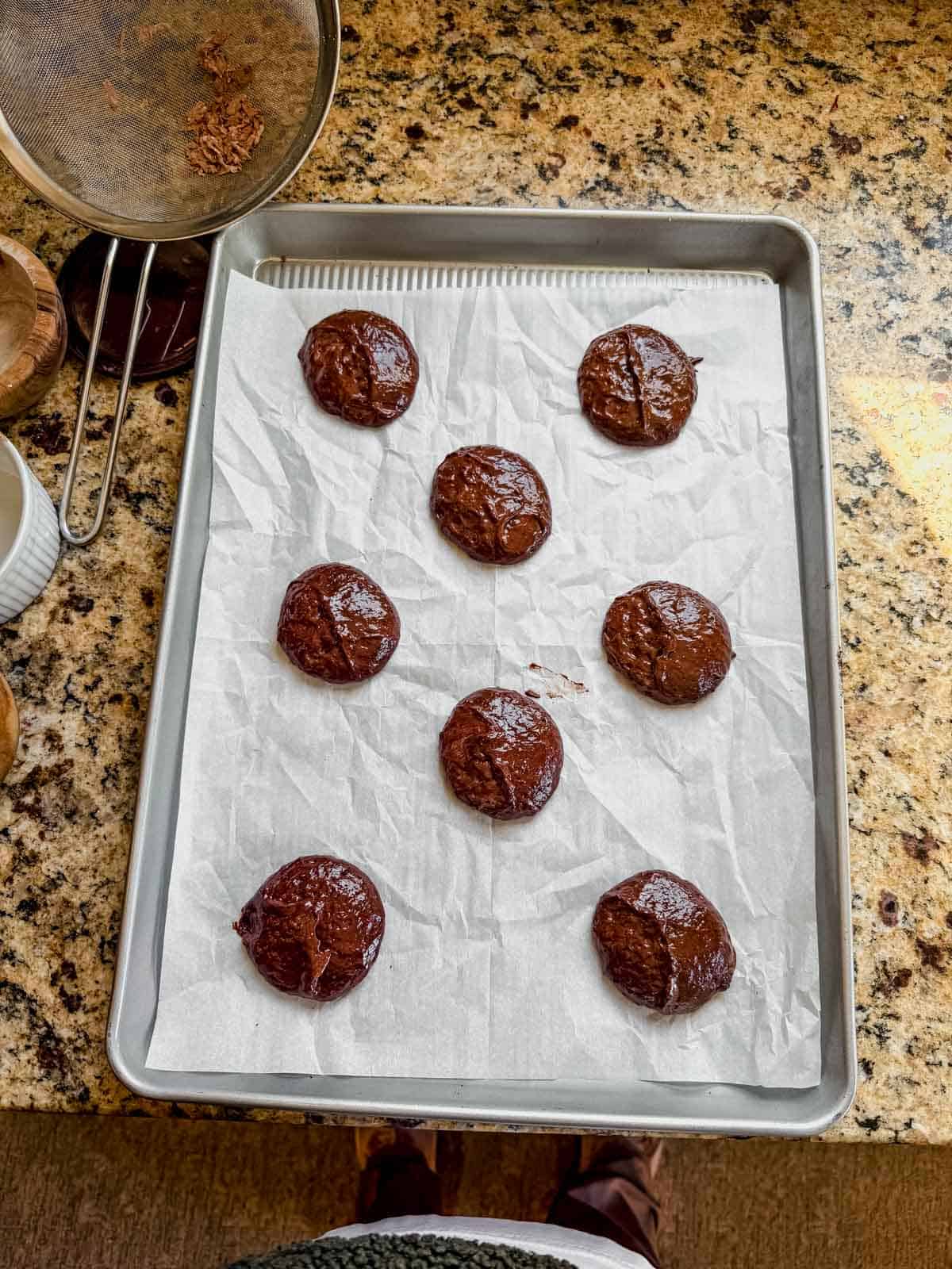 - Use a medium (2 Tablespoon) cookie scoop to scoop out all of the dough out at once onto the prepared baking sheets. This makes about 16 cookies and they should fit comfortable on 2 baking sheets. You need to bake them all quickly for the best crackly glossy tops.