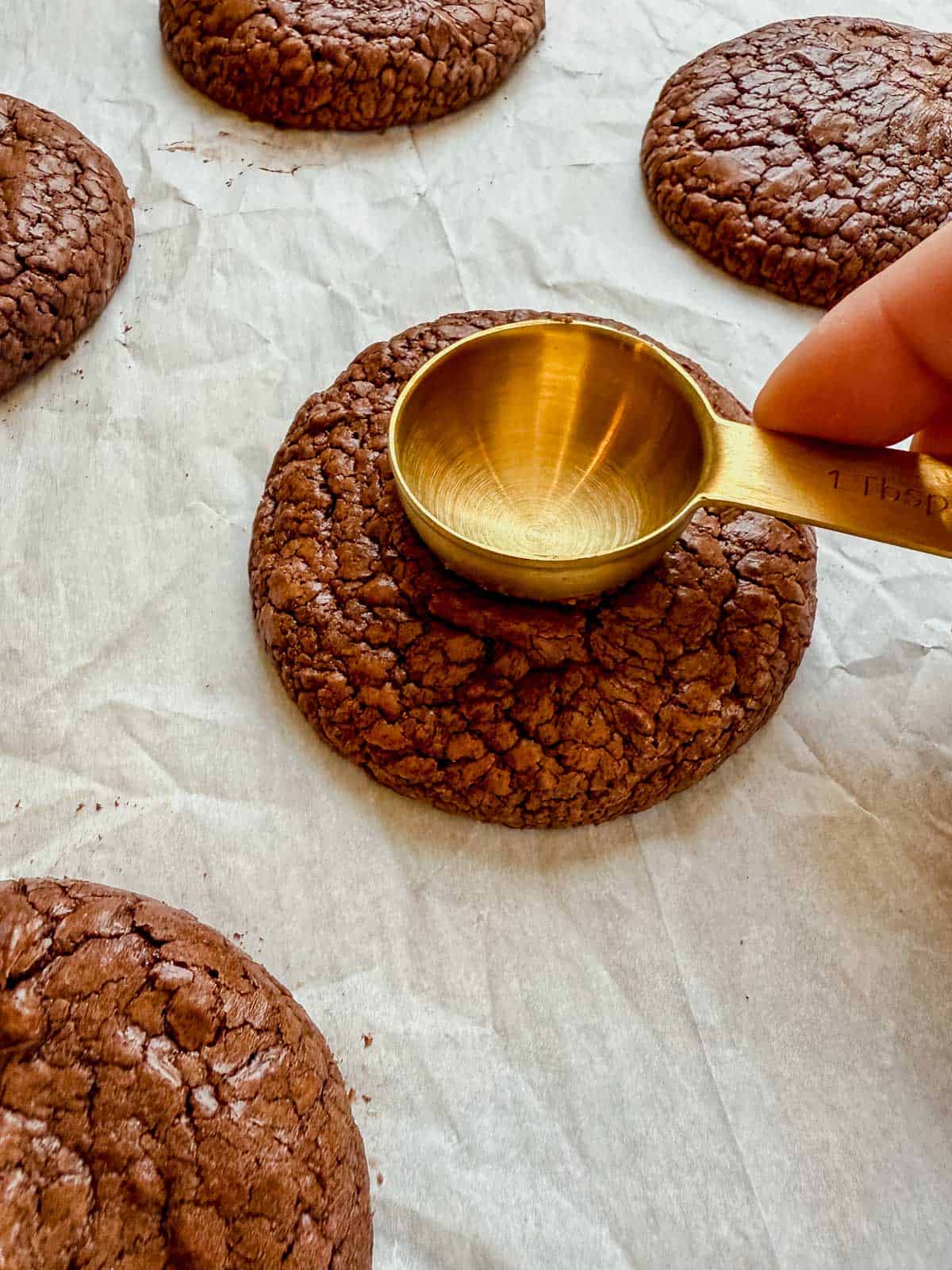- Directly from the oven you can use a round cookie cutter or rim of a glass to nudge and shape the cookies into a perfect circle. Immediately use the back of a small spoon (like a Tablespoon) to press a shallow indent into the center of each warm cookies. Allow the cookies to cool on the baking sheet for 10 minutes before transferring to a wire rack.